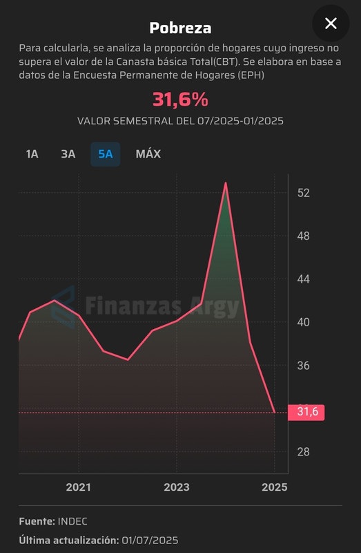 En el primer semestre de 2024 (inicio de la actual gestión), la pobreza había alcanzado un pico del 52,9%, afectando a casi 25 millones de personas. Desde entonces bajó fuerte gracias a la desaceleración de la inflación y la recuperación gradual de los ingresos reales en algunos sectores, aunque sigue siendo un problema estructural alto. La indigencia se estima en torno al 6,7-6,9%.